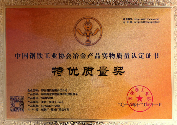 橋梁纜索熱鍍鋅鋼絲用熱軋盤條SWRS82BΦ11~Φ14(mm)獲得冶金產(chǎn)品實物質量“特優(yōu)質量獎”