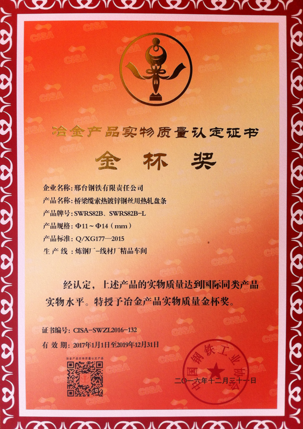 橋梁纜索熱鍍鋅鋼絲用熱軋盤條SWRS82B、SWRS82B-L Φ11~Φ14(mm)獲得冶金產(chǎn)品實物質量“金杯獎”