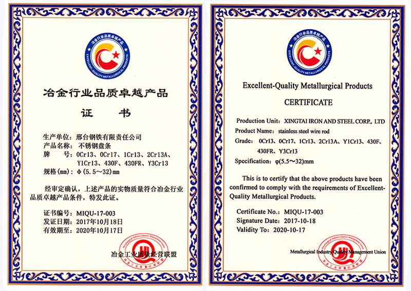 不銹鋼盤條0Cr13、0Cr17、1Cr13、2Cr13A、Y1Cr13、430F、430FR、Y3Cr13共8個牌號φ5.5- 32mm規(guī)格獲冶金行業(yè)品質卓越產(chǎn)品