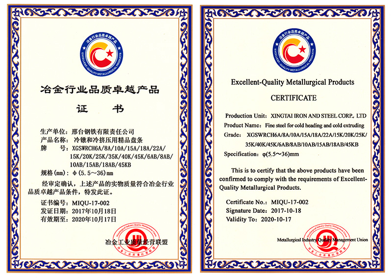 冷鐓和冷擠壓用精品盤條XGSWRCH6A/8A/10A/15A/18A/22A/15K/20K/25K/35K/40K/45K/6AB/8AB/10AB/15AB/18AB/45KB共18個牌號φ5.5- 36mm規(guī)格獲冶金行業(yè)品質卓越產(chǎn)品