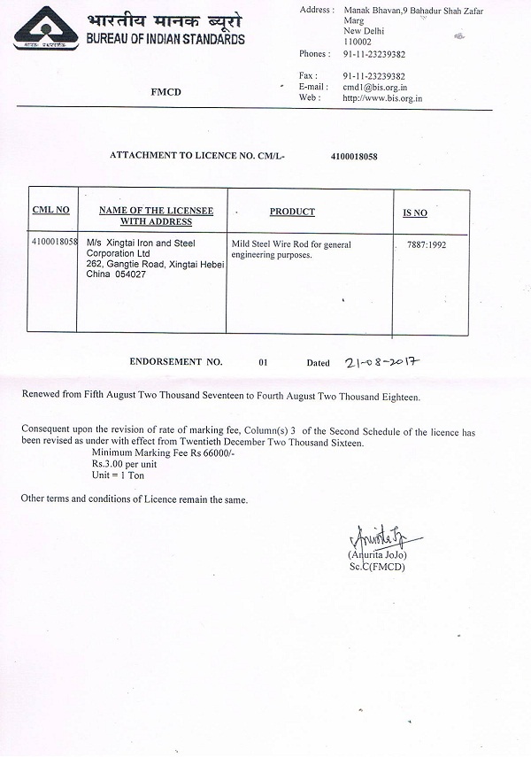 邢鋼申請印度BIS認證的6個產(chǎn)品牌號(對應邢鋼49個產(chǎn)品牌號)通過印度國家認證