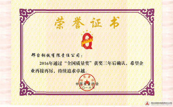 邢鋼于2013年獲得全國質(zhì)量獎,獲獎后邢鋼繼續(xù)實(shí)踐《卓越績效評價(jià)準(zhǔn)則》,深入推進(jìn)卓越績效管理模式,持續(xù)改進(jìn),不斷追求卓越。2016年9月全國質(zhì)量獎評審活動領(lǐng)導(dǎo)小組組織專家對邢鋼進(jìn)行了全國質(zhì)量獎獲獎三年后的現(xiàn)場確認(rèn),通過專家小組的現(xiàn)場提問、材料匯報(bào)、生產(chǎn)現(xiàn)場的參觀,邢鋼順利通過了“全國質(zhì)量獎”獲獎三年后確認(rèn)并頒發(fā)證書。