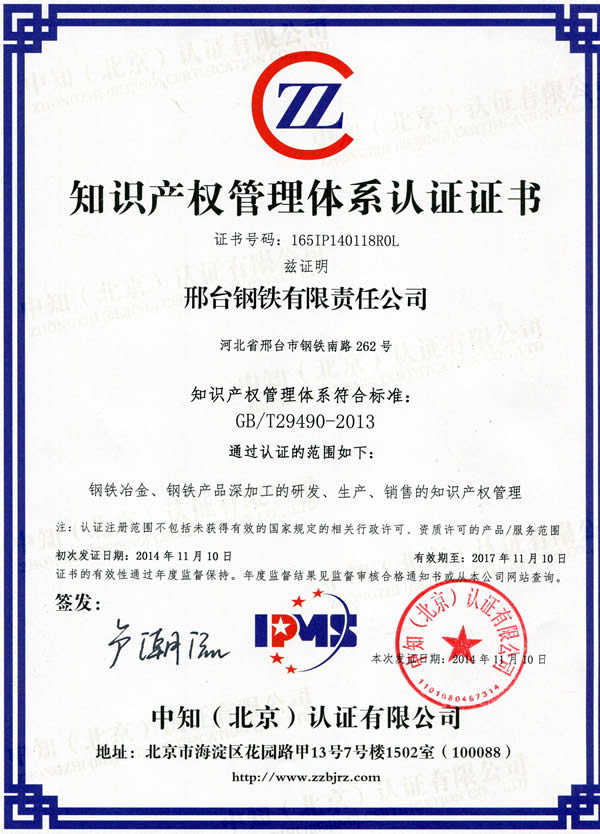 2014年11月10日,邢鋼通過(guò)GB/T29490-2013認(rèn)證,中知(北京)認(rèn)證有限公司向邢鋼頒發(fā)了《知識(shí)產(chǎn)權(quán)管理體系認(rèn)證證書》。