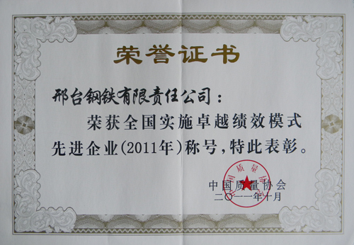 2011年10月,邢鋼榮獲“全國(guó)實(shí)施卓越績(jī)效模式先進(jìn)企業(yè)(2011年)稱號(hào)”。