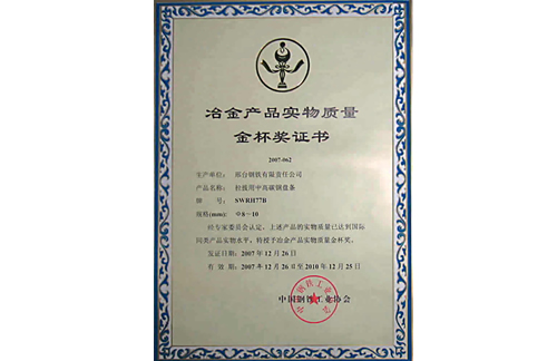 2007年12月,邢鋼拉拔用中高碳鋼盤條獲冶金產(chǎn)品實物質(zhì)量金杯獎。