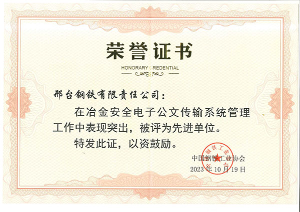 2023年10月,邢鋼在冶金安全電子公文傳輸系統(tǒng)管理工作中表現(xiàn)突出,被中國鋼鐵工業(yè)協(xié)會評為先進(jìn)單位。