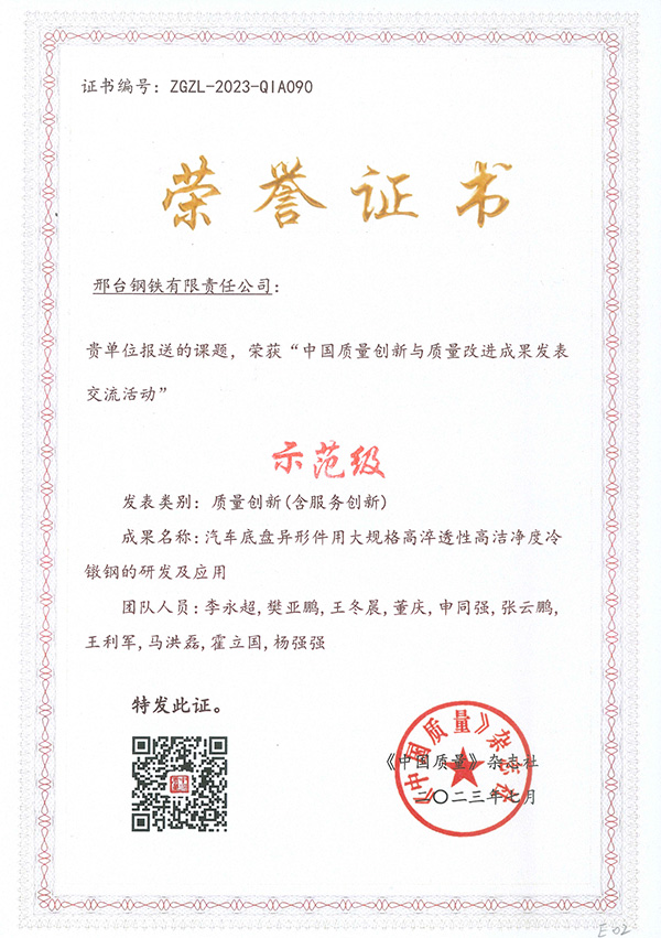 2023年7月,邢臺鋼鐵有限責(zé)任公司被河北省質(zhì)量文化協(xié)會評為“河北省質(zhì)量創(chuàng)新活動標(biāo)桿單位”。