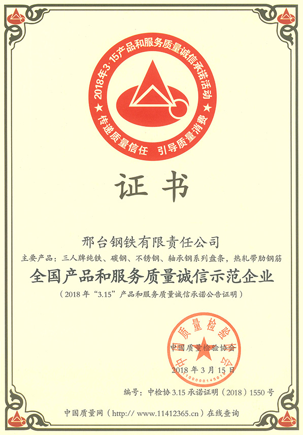 2018年3月15日,邢鋼(“三人牌”產(chǎn)品包括純鐵、碳鋼、不銹鋼、軸承鋼系列盤條和熱軋帶肋鋼筋)被中國質(zhì)量檢驗(yàn)協(xié)會授予“全國產(chǎn)品和服務(wù)質(zhì)量誠信示范企業(yè)”稱號。