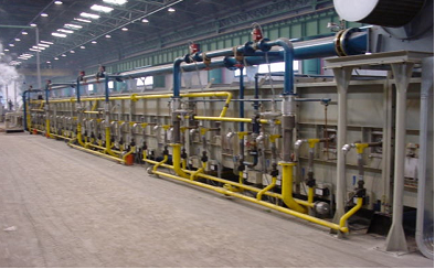 4、索氏體化淬火:采用熔融的鉛作為淬火劑,在600℃左右完成鋼絲組織由奧實(shí)體化向索氏體化的轉(zhuǎn)變。采用燃?xì)夥侄喂幔鞫螁为?dú)控溫,根據(jù)鉛溫要求及時調(diào)整供熱負(fù)荷。