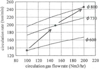 提高鋼水循環(huán)流量是加速RH脫碳的主要手段。提高提升氣體流量,增大浸漬管直徑,降低真空室壓力,均能增大循環(huán)流量,加速脫碳速率,其中浸漬管直徑變化的影響最大。浸漬管內徑和提升氣體流量對循環(huán)流量的影響如下圖所示。
