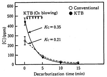 由上圖可以看出,脫碳處理初始階段采用KTB吹氧可以明顯提高脫碳速率。采用KTB和不采用KTB的表觀脫碳速率常數分別為0.35min-1、0.21min-1,而且由于采用KTB吹氧技術提高了脫碳速率,可以使脫碳處理時間縮短了3min。