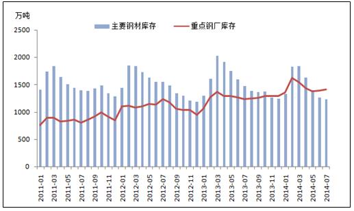 目前,中國鋼材市場正處于去庫存時期,主要鋼材的庫存量正在快速減少。據(jù)我的鋼鐵數(shù)據(jù)庫顯示截止2014年8月8日,中國主要鋼材庫存量為1190.35萬噸,與去年相比下降202萬噸,同比降幅為14.5%。3月至7月的平均降速達到9.62%,已大幅度超過以往的去庫存速度。庫存量的快速下降,一般意味著下游行業(yè)對鋼材需求的增加,鋼材市場的情況理應(yīng)十分良好,但實際上鋼材的價格卻是不增反降。據(jù)悉,中國7月的Myspic普鋼絕對價格指數(shù)為3393.54元/噸,同比下降8.56%。