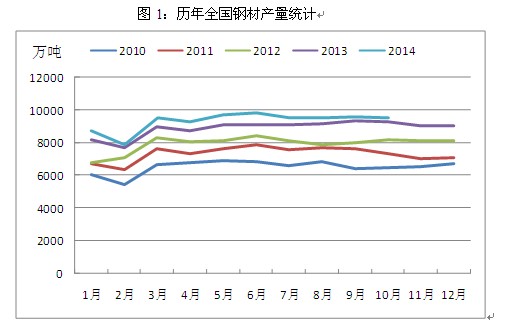其一,鋼材產(chǎn)量增速有所回落。根據(jù)統(tǒng)計(jì),2014年1-10月,我國(guó)粗鋼產(chǎn)量68535萬(wàn)噸,同比增長(zhǎng)2.1%,增速同比減緩7.1個(gè)百分點(diǎn);鋼材產(chǎn)量93447萬(wàn)噸,增長(zhǎng)4.7%,減緩6.9個(gè)百分點(diǎn),國(guó)家政策的導(dǎo)向在這其中起了主要作用。一方面,2014年我國(guó)從政策上嚴(yán)格限制了鋼鐵等產(chǎn)能過(guò)剩行業(yè)的投資,由此導(dǎo)致除新疆地區(qū)外,其余省份全年均無(wú)高爐新建計(jì)劃,鋼鐵新增產(chǎn)能被控制;另一方面,京津冀地區(qū)持續(xù)霧霾天氣引發(fā)了公眾普遍擔(dān)憂(yōu),作為全國(guó)鋼鐵生產(chǎn)基地的河北省不時(shí)由于環(huán)境污染而被強(qiáng)制采取限產(chǎn)措施,雖然對(duì)于環(huán)保排污設(shè)施較為齊全的大型鋼廠(chǎng)影響有限,但中小型鋼廠(chǎng)的生產(chǎn)卻受到了較為明顯的影響,全國(guó)鋼材整體產(chǎn)量增速下滑也就變得順理成章