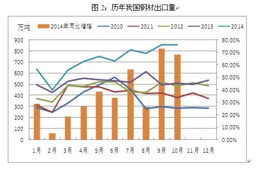 其二,鋼材出口大幅增加。在前兩年鋼材出口增速始終徘徊不前的情況下,2014年我國(guó)鋼材出口量增長(zhǎng)迅速,海關(guān)數(shù)據(jù)顯示,2014年1-10月我國(guó)共出口鋼材7389.3萬(wàn)噸,同比大幅增長(zhǎng)42.2%,在2014年之前,鋼材出口只占我國(guó)鋼鐵行業(yè)總產(chǎn)量中微不足道的3%,而2014年這一占比卻猛增到10%以上,外需大增極大程度上緩解了國(guó)內(nèi)鋼鐵行業(yè)的供應(yīng)壓力,這也導(dǎo)致在鋼材產(chǎn)量仍在緩慢增長(zhǎng)的情況下我國(guó)鋼鐵行業(yè)供需關(guān)系卻有所緩和。