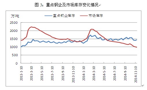 其三,鋼廠(chǎng)經(jīng)營(yíng)風(fēng)險(xiǎn)有所上升。由于近兩年鋼價(jià)持續(xù)大幅下跌,市場(chǎng)上的鋼貿(mào)商苦不堪言,相較于家大業(yè)大且有地方政府扶持的鋼廠(chǎng),鋼貿(mào)商的日子更加難熬,在持續(xù)虧損以及資金壓力下,超半數(shù)鋼貿(mào)商選擇退出。依然活躍于市場(chǎng)的鋼貿(mào)商在操作上也不復(fù)以往的大開(kāi)大合,小心謹(jǐn)慎成為了多數(shù)鋼貿(mào)商的選擇,由此帶來(lái)的直接后果就是市場(chǎng)庫(kù)存向鋼廠(chǎng)庫(kù)存轉(zhuǎn)移。截止2014年10月末,全國(guó)主要城市鋼材庫(kù)存約為1043萬(wàn)噸,較2013年同期相比大幅下降25.7%,與之相反的是,此時(shí)重點(diǎn)鋼企庫(kù)存增加到1414.3萬(wàn)噸,較2013年同期上升9.8%,隨著鋼貿(mào)商 “蓄水池”功能的減弱,鋼廠(chǎng)對(duì)于價(jià)格調(diào)整以及生產(chǎn)策略的變動(dòng)將更為敏感,但與此同時(shí)鋼廠(chǎng)也將承擔(dān)更大的經(jīng)營(yíng)風(fēng)險(xiǎn)。