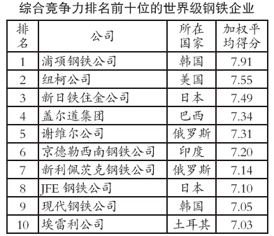 浦項鋼鐵公司在技術工人熟練程度、技術創(chuàng)新能力、聯(lián)盟與合資、所在國家風險等方面獲得10分的滿分,但在獲取鐵礦石、煉焦煤等煉鋼原料和能源成本、國內市場趨于飽和等方面存在明顯短板,得分也相對較低,該公司以加權平均7.91分(滿分為10分)繼續(xù)位居榜首,與去年得分相比沒有變化。