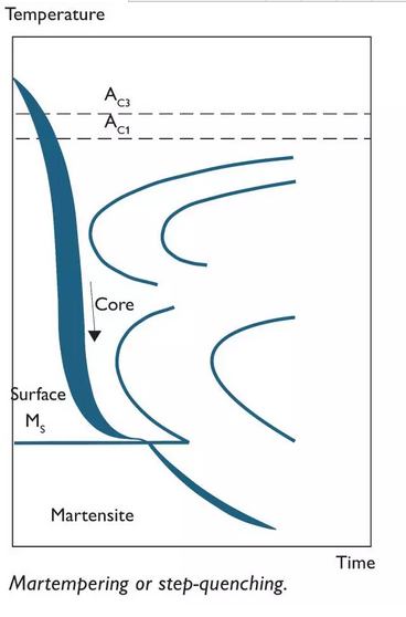 緩慢淬火導(dǎo)致部件的表面和芯之間的較小溫度差,并且不同厚度的部分將具有更均勻的冷卻速率。在低于Ms溫度的馬氏體范圍內(nèi)淬火時,這是非常重要的。