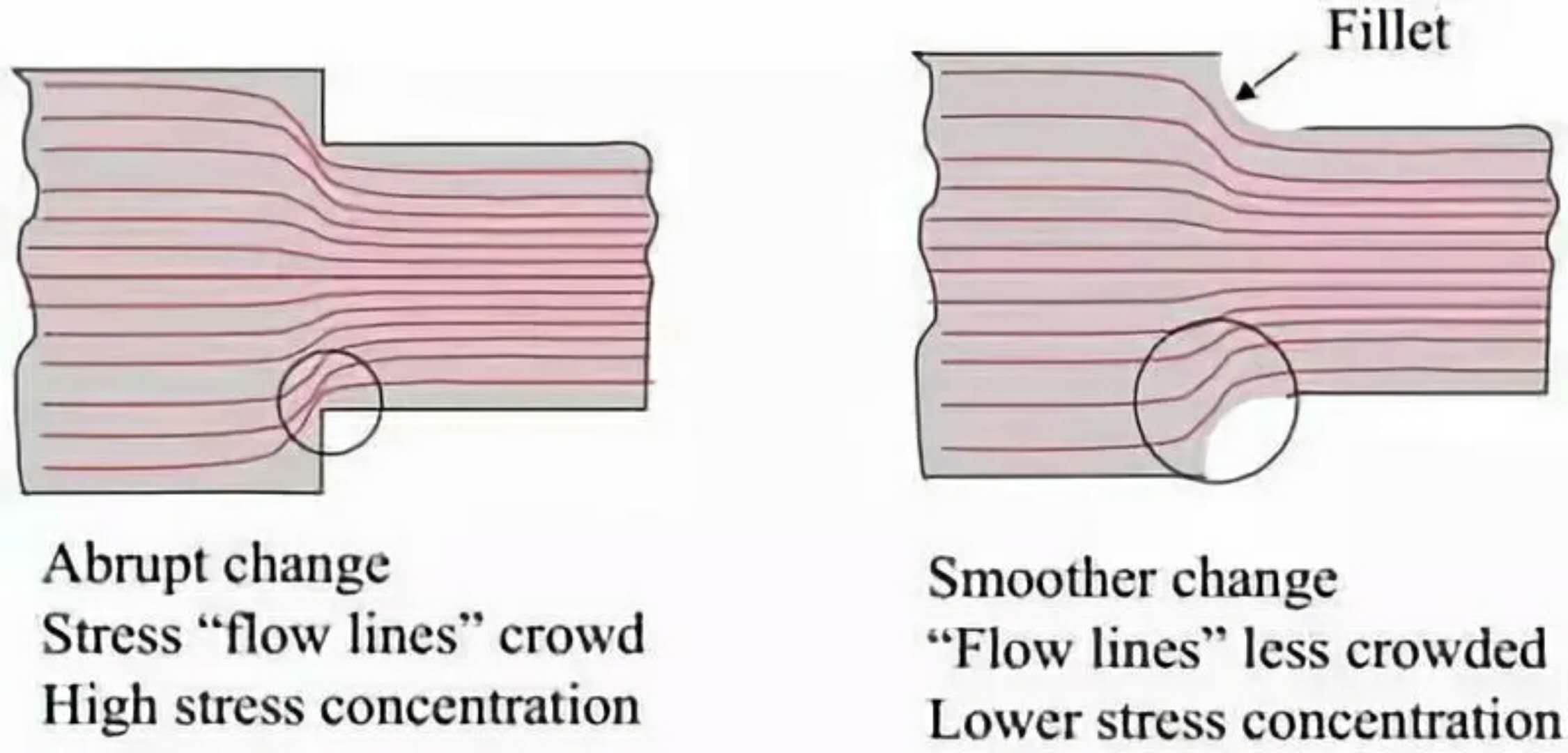 實際上,所有的疲勞失效都發(fā)生在應力集中點或應力集中處的零件的外表面上。例如,凹槽、圓角、孔、螺紋、鍵槽、花鍵、焊縫等。如果該部件提供長期無故障的服務,設(shè)計者必須考慮到這些應力提升器的影響。應力集中的作用直接與其半徑小有關(guān)。與先前提到的促進疲勞失效的微裂紋一樣,應力發(fā)生位置的半徑越小,產(chǎn)生的應力越集中越大。有趣的是,應力集中對高延展性的金屬影響很小。其解釋是,由幾何變化引起的應力集中被限制在屈服應力,止于塑性變形。