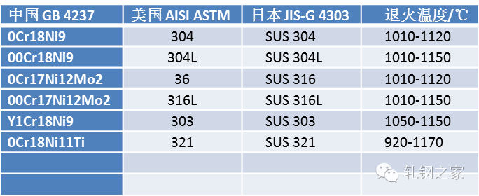 奧氏體不銹鋼的代表鋼種是 18-8 鋼(304),因為是奧氏體組織,所以具有無磁性 且沒有淬硬性等特點。由于該鋼種不發(fā)生相變,其熱處理就是加熱到高溫(一般在1000℃以上),奧氏體再結晶的同時,使在加工中產生的碳化物和。相分解物固溶到奧 氏體中,然后快速冷卻,使碳呈固溶狀態(tài)的奧氏體保持到常溫,這―處理過程即為固溶處理。表 1 為奧氏體不銹鋼的參考退火溫度。