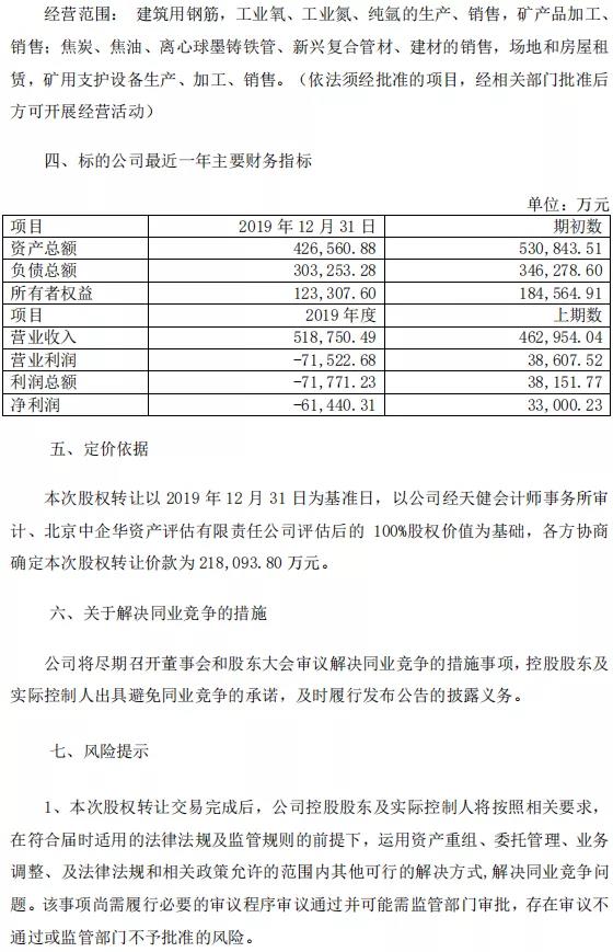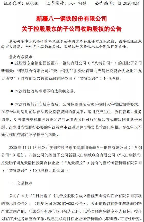11月13日晚間,八一鋼鐵發(fā)布公告稱,該公司控股股東寶鋼集團新疆八一鋼鐵有限公司的控股子公司新疆天山鋼鐵聯(lián)合有限公司擬受讓深圳九天清控投資合伙企業(yè)持有的新興鑄管新疆有限公司100%股權(quán)。11月13日,天山鋼鐵與九天清控簽署了《股權(quán)轉(zhuǎn)讓協(xié)議》。本次股權(quán)轉(zhuǎn)讓以2019年12月31日為基準日,以公司經(jīng)天健會計師事務(wù)所審計、北京中企華資產(chǎn)評估有限責(zé)任公司評估后的100%股權(quán)價值為基礎(chǔ),各方協(xié)商確定本次股權(quán)轉(zhuǎn)讓價款為21.81億元。