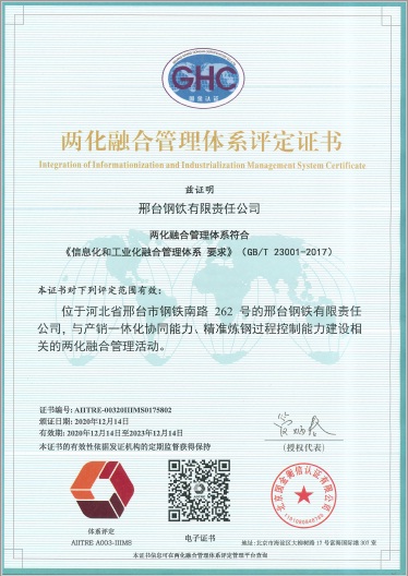 Xingtai Steel started the standards implementation of Integration of Information and Industrialization management systems at the end of 2016. In December 14th, 2017, Xingtai Steel got the certificate for the first time. Since the operation of this management system, the lean production capacity of the company has been greatly improved.