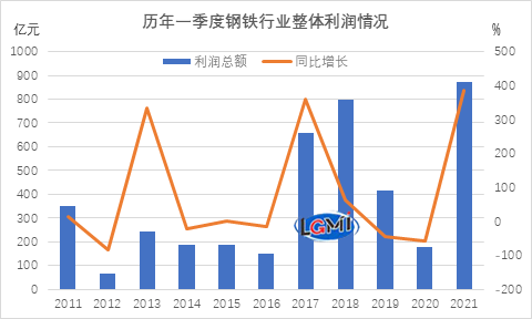 熱點事件:國家統(tǒng)計局數(shù)據(jù)顯示,2021年一季度,黑色金屬冶煉和壓延加工業(yè)實現(xiàn)營業(yè)收入20483.1億元,同比增長50.5%;營業(yè)成本18837.3億元,同比增長47.7%;實現(xiàn)利潤總額871.4億元,同比增長387.6%。