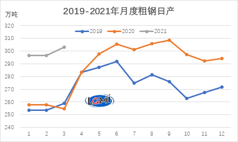 圖2 2019-2021年各月粗鋼日產變化