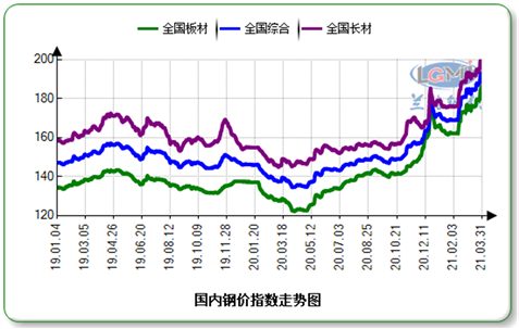 一季度,在需求提振、成本支撐、環(huán)保加碼、國內外大宗商品整體上漲帶動下,國內鋼鐵市場震蕩上行,據(jù)蘭格鋼鐵云商平臺監(jiān)測數(shù)據(jù)顯示,一季度,蘭格鋼鐵綜合鋼材價格指數(shù)均值為177,同比上升22.5%;長材價格指數(shù)為184.2,同比上升22.5%;板材價格指數(shù)為169.7,同比上升29.0%。從鋼材均價來看,一季度蘭格鋼鐵綜合鋼材均價為4868元/噸,較上年同期上漲同比上漲977元/噸,同比上漲25.1%。