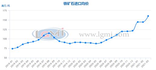 一季度鋼鐵原料價格明顯上漲。據(jù)蘭格鋼鐵云商平臺監(jiān)測數(shù)據(jù)顯示,一季度海關進口鐵礦石均價為150.8美元/噸,較2020年一季度上漲66.4%;唐山二級冶金焦均價為2560元/噸,較2020年一季度上漲39.1%;唐山重廢均價為3081元/噸,較2020年一季度上漲23.5%。在原料價格上漲帶動下,鋼鐵生產成本大幅上漲,據(jù)蘭格鋼鐵研究中心測算數(shù)據(jù)顯示,2021年一季度普碳方坯成本較2020年上漲849元/噸,漲幅達31.3%。