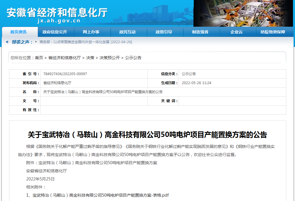 根據(jù)《國務(wù)院關(guān)于化解產(chǎn)能嚴重過剩矛盾的指導(dǎo)意見》《國務(wù)院關(guān)于鋼鐵行業(yè)化解過剩產(chǎn)能實現(xiàn)脫困發(fā)展的意見》和《鋼鐵行業(yè)產(chǎn)能置換實施辦法》要求,現(xiàn)將寶武特冶(馬鞍山)高金科技有限公司50噸電爐項目產(chǎn)能置換方案予以公告,歡迎社會公眾進行監(jiān)督。