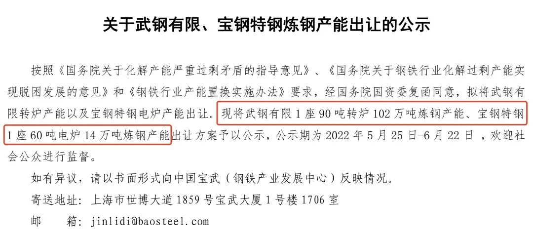 按照《國務(wù)院關(guān)于化解產(chǎn)能嚴重過剩矛盾的指導(dǎo)意見》、《國務(wù)院關(guān)于鋼鐵行業(yè)化解過剩產(chǎn)能實現(xiàn)脫困發(fā)展的意見》和《鋼鐵行業(yè)產(chǎn)能置換實施辦法》要求,經(jīng)國務(wù)院國資委復(fù)函同意,擬將武鋼有限轉(zhuǎn)爐產(chǎn)能以及寶鋼特鋼電爐產(chǎn)能出讓?,F(xiàn)將武鋼有限1座90噸轉(zhuǎn)爐102萬噸煉鋼產(chǎn)能、寶鋼特鋼1座60噸電爐14萬噸煉鋼產(chǎn)能出讓方案予以公示,公示期為2022年5月25日-6月22日,歡迎社會公眾進行監(jiān)督。