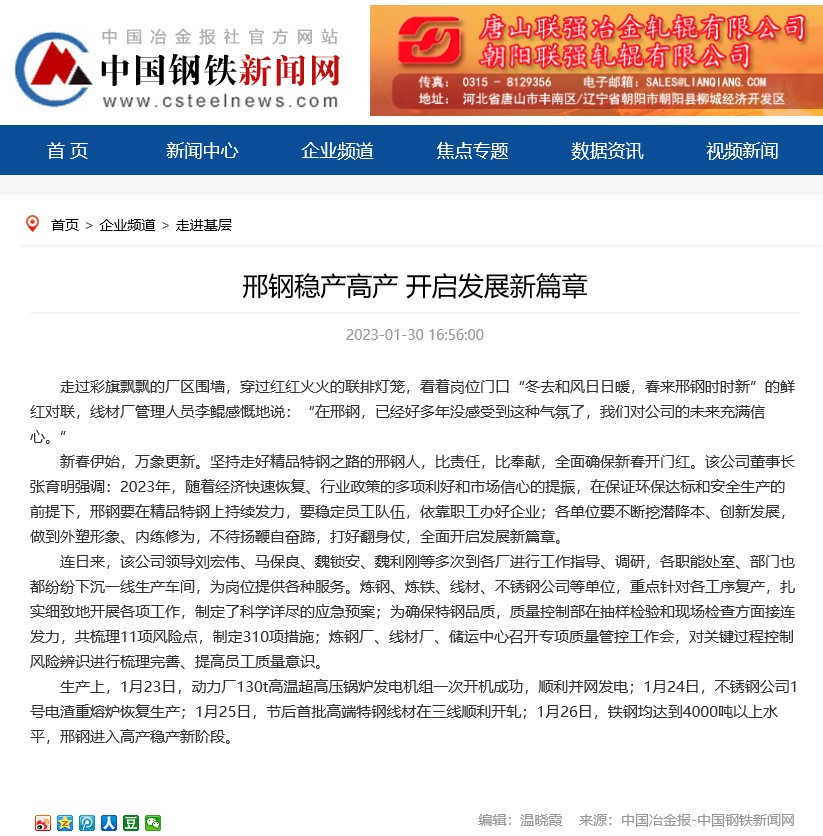 新春伊始,萬象更新。堅持走好精品特鋼之路的邢鋼人,比責(zé)任,比奉獻(xiàn),全面確保新春開門紅。該公司董事長張育明強(qiáng)調(diào):2023年,隨著經(jīng)濟(jì)快速恢復(fù)、行業(yè)政策的多項利好和市場信心的提振,在保證環(huán)保達(dá)標(biāo)和安全生產(chǎn)的前提下,邢鋼要在精品特鋼上持續(xù)發(fā)力,要穩(wěn)定員工隊伍,依靠職工辦好企業(yè);各單位要不斷挖潛降本、創(chuàng)新發(fā)展,做到外塑形象、內(nèi)練修為,不待揚(yáng)鞭自奮蹄,打好翻身仗,全面開啟發(fā)展新篇章。