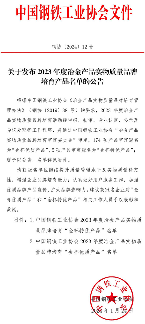 冶金產(chǎn)品實物質(zhì)量品牌培育產(chǎn)品認定活動,是中鋼協(xié)在鋼鐵行業(yè)組織開展的認定評價活動,也是國內(nèi)唯一一項針對鋼鐵行業(yè)實物產(chǎn)品質(zhì)量進行認定的評價活動。旨在評選行業(yè)標桿產(chǎn)品,擴大中國鋼鐵行業(yè)優(yōu)秀產(chǎn)品影響力及占有率,提升產(chǎn)品品牌價值與口碑。通過的產(chǎn)品,不僅代表了產(chǎn)品質(zhì)量的穩(wěn)定性和先進性,更反映了企業(yè)管理的卓越性,是得到行業(yè)內(nèi)專家、同行和客戶都認可的優(yōu)秀產(chǎn)品,對增加產(chǎn)品銷量、提高產(chǎn)品品牌起著重要的作用,是一種無形價值和財富。