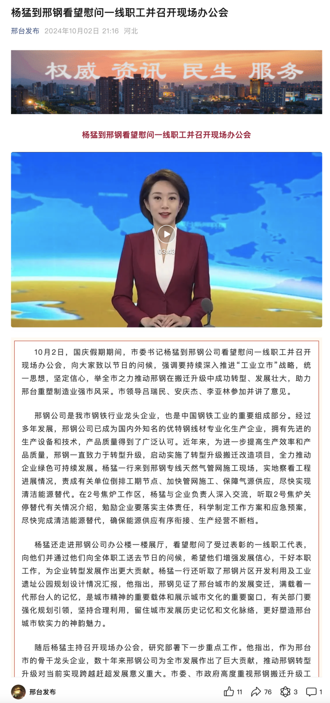 10月2日,國慶假期期間,市委書記楊猛到邢鋼公司看望慰問一線職工并召開現(xiàn)場辦公會(huì),向大家致以節(jié)日的問候,強(qiáng)調(diào)要持續(xù)深入推進(jìn)“工業(yè)立市”戰(zhàn)略,統(tǒng)一思想,堅(jiān)定信心,舉全市之力推動(dòng)邢鋼在搬遷升級中成功轉(zhuǎn)型、發(fā)展壯大,助力邢臺重塑制造業(yè)強(qiáng)市風(fēng)采。市領(lǐng)導(dǎo)呂瑞民、安慶杰、李亞林參加并講了意見。