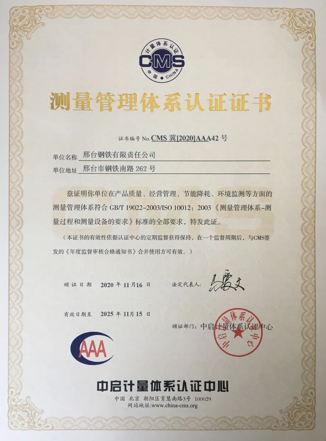 近日,邢鋼正式獲得由中啟認(rèn)證中心頒發(fā)的AAA級«測量管理體系年度監(jiān)督審核合格通知書»,該證書是測量管理體系認(rèn)證的最高等級證書,證書的持續(xù)取得,標(biāo)志著我公司測量管理水平已達(dá)到國家和國際標(biāo)準(zhǔn)要求。