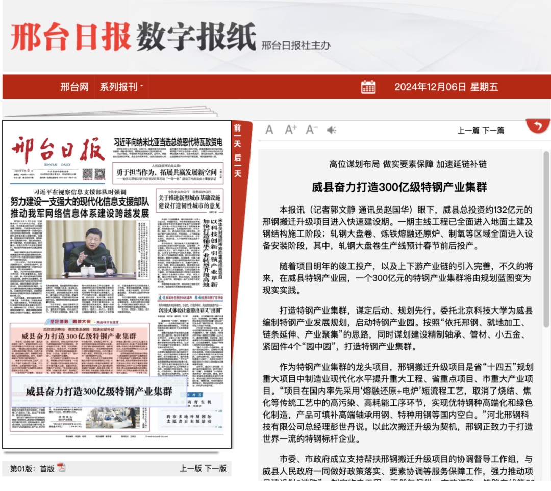 隨著項目明年的竣工投產,以及上下游產業(yè)鏈的引入完善,不久的將來,在威縣特鋼產業(yè)園,一個300億元的特鋼產業(yè)集群將由規(guī)劃藍圖變?yōu)楝F實實踐。