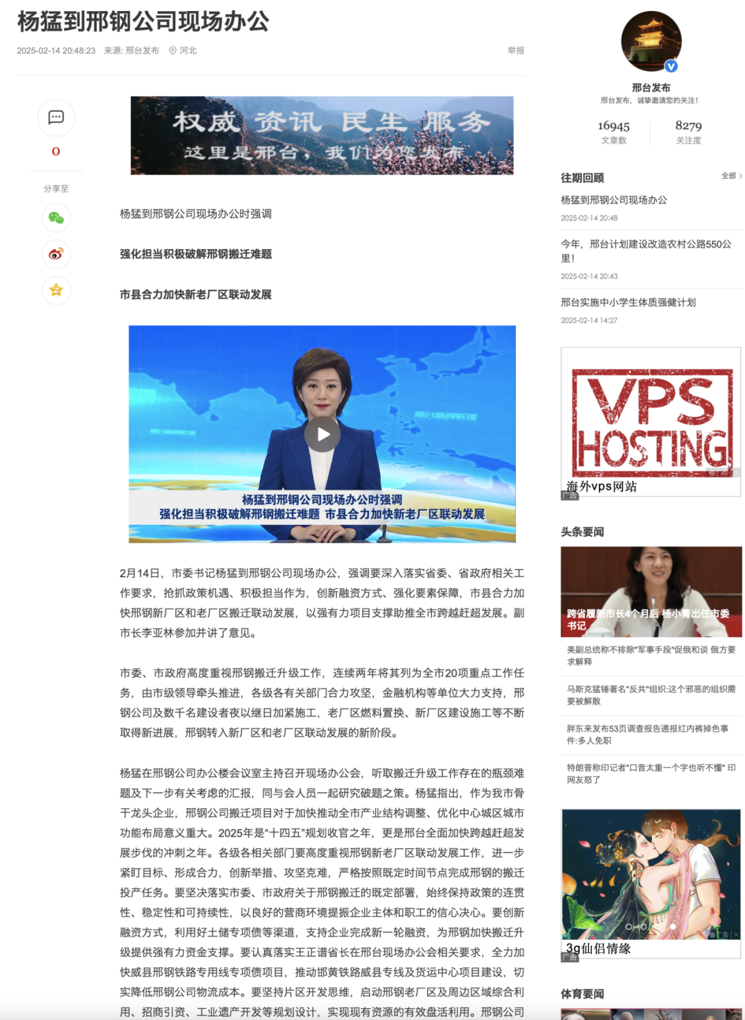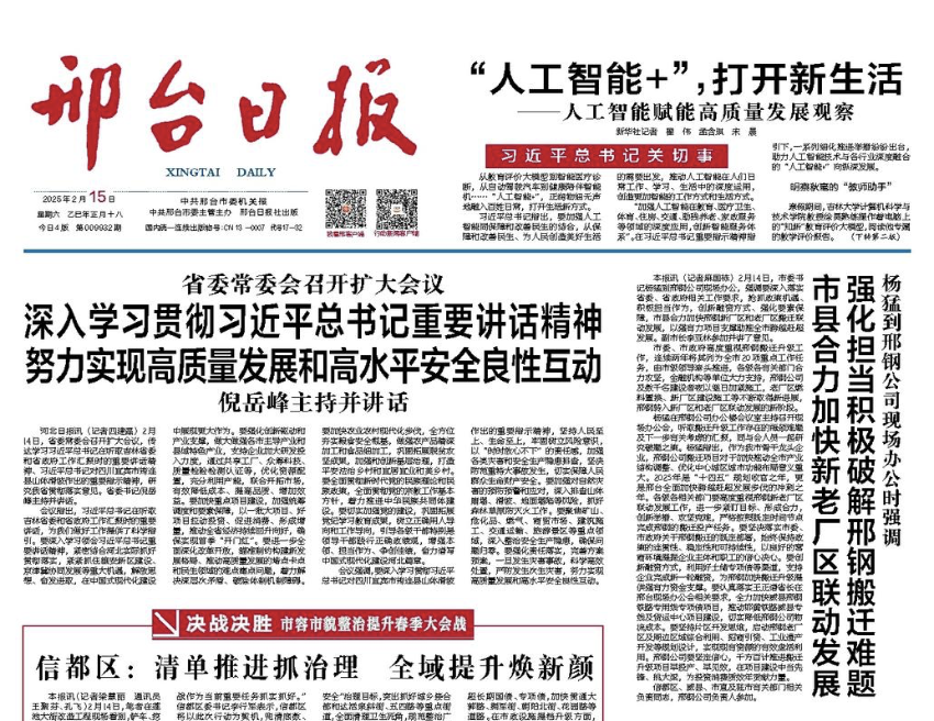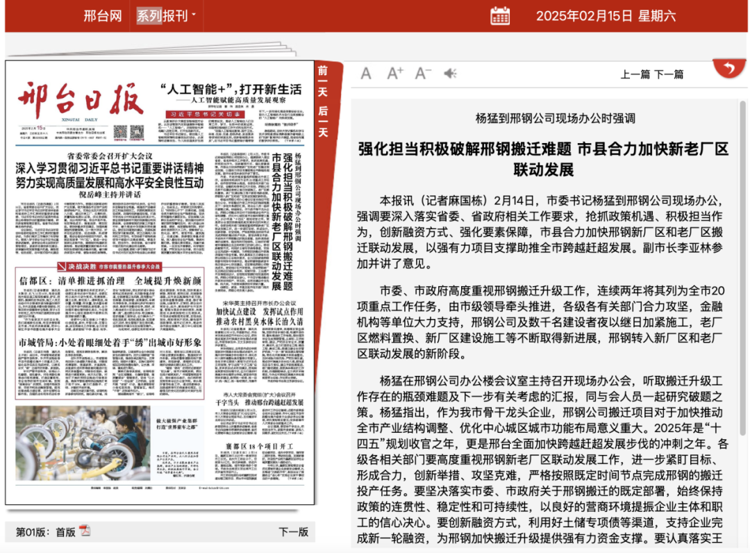 2月14日,市委書記楊猛到邢鋼公司現(xiàn)場辦公,強(qiáng)調(diào)要深入落實(shí)省委、省政府相關(guān)工作要求,搶抓政策機(jī)遇、積極擔(dān)當(dāng)作為,創(chuàng)新融資方式、強(qiáng)化要素保障,市縣合力加快邢鋼新廠區(qū)和老廠區(qū)搬遷聯(lián)動發(fā)展,以強(qiáng)有力項(xiàng)目支撐助推全市跨越趕超發(fā)展。副市長李亞林參加并講了意見。